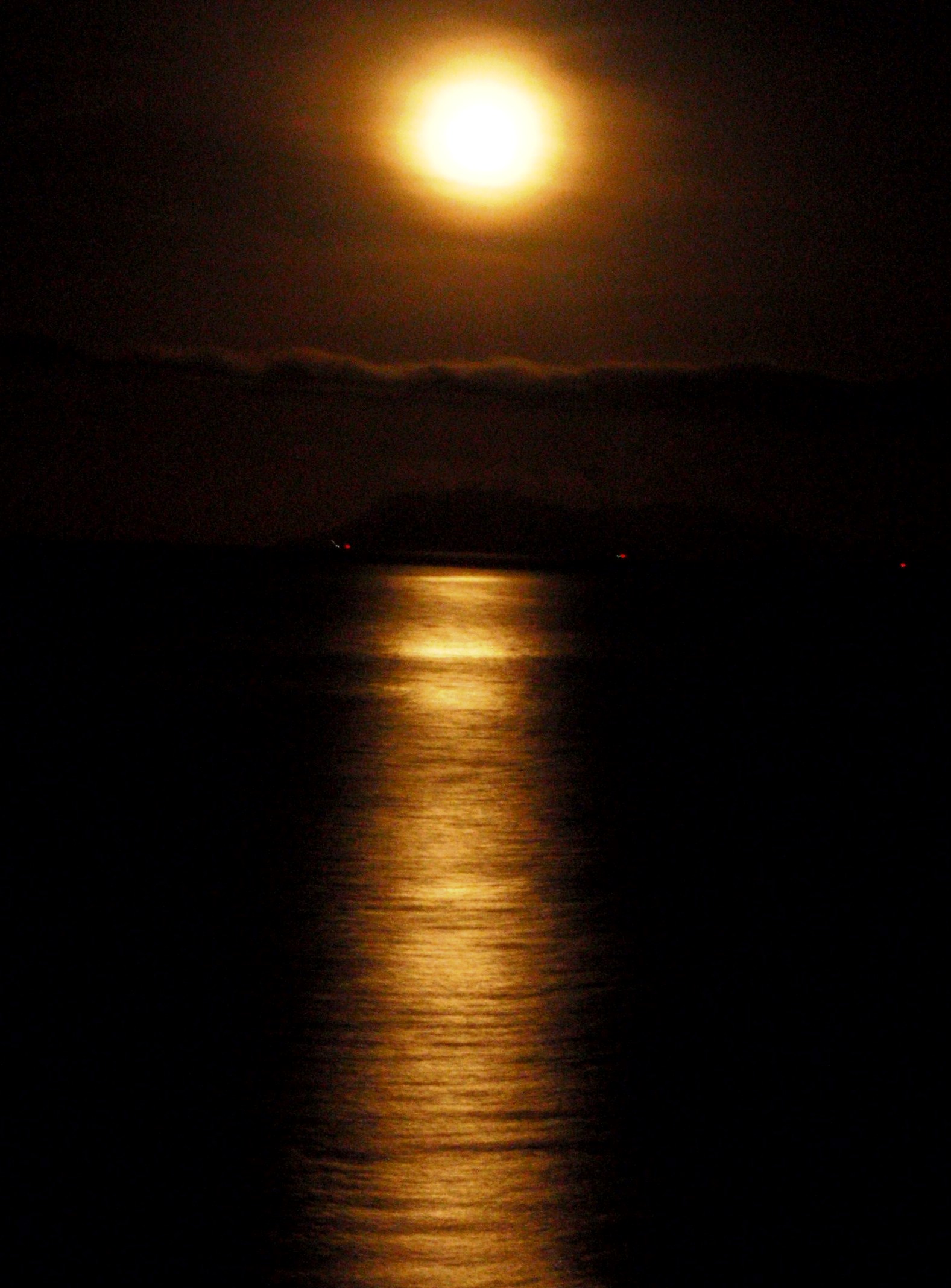A band of cloud crosses the reflected light of the moon producing the image of a cross. The light also produces a key-hole shape.